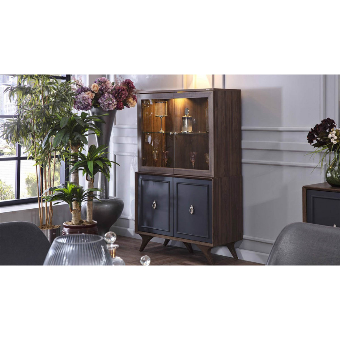 Двухстворчатый шкаф витрина для посуды ALEG-13 серии Алегро от Беллона украсит собой любую просторную гостиную и столовую. Выбранный темный цвет мебели эффектно дополняется вставкой из МДФ по фасаду. Массивные ножки из МДФ придают больше респектабельности и лоска витрине. В нашем магазине купить двустворчатый сервант Алегро можно отдельно, в серии имеется также однодверный вариант.