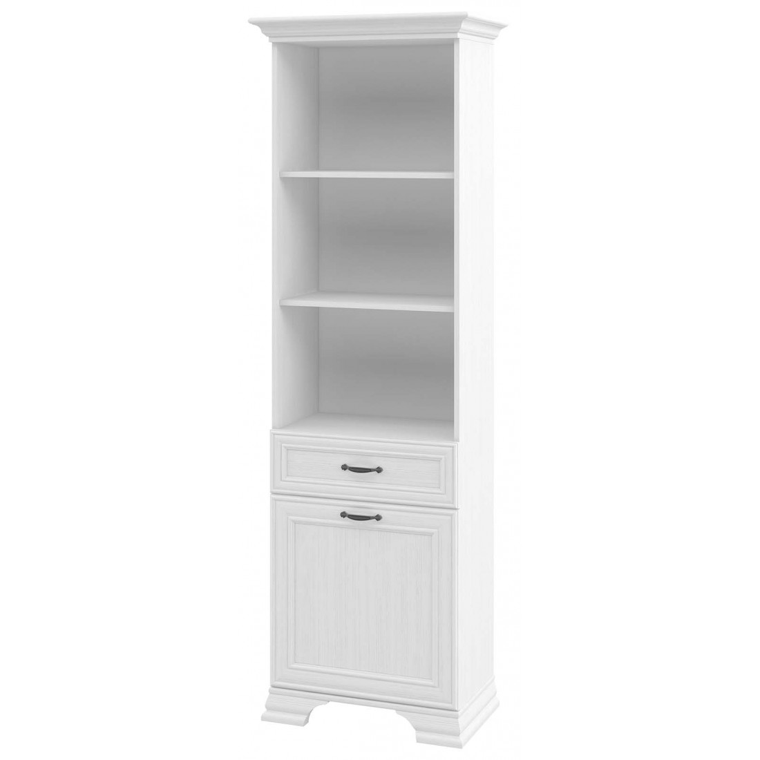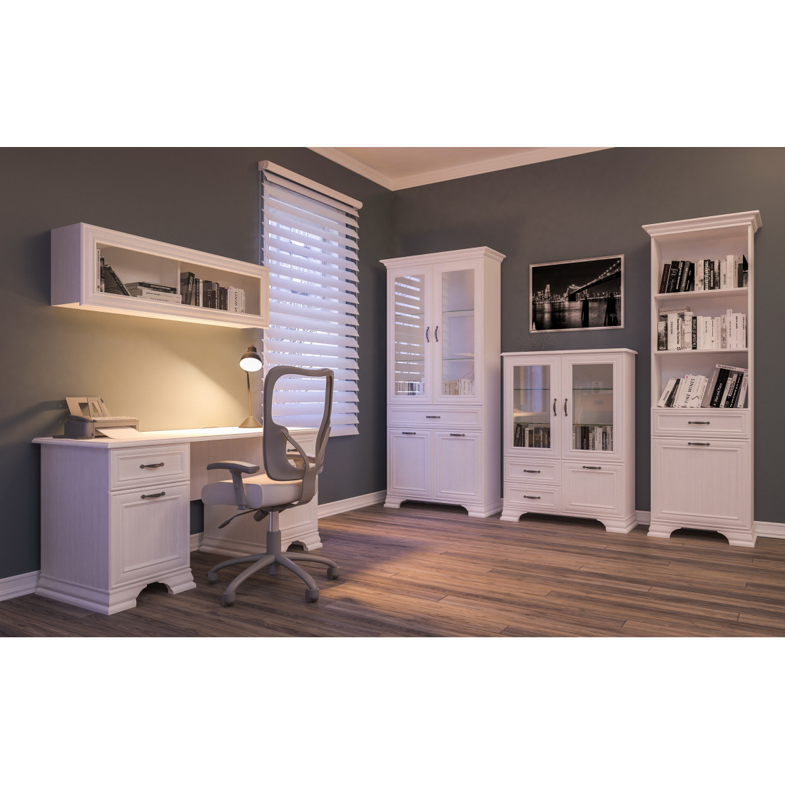 Мебель для кабинета Юнона от фабрики Мебель-Неман - это новинка 2019 года в классическом стиле с отделкой структурной фактуры, обрамленная рамочным фасадом, где металлические ручки выгодно подчёркивают стиль и изящество, всегда актуальна и востребована. Полки у шкафа-витрины и тумбы - стеклянные.
