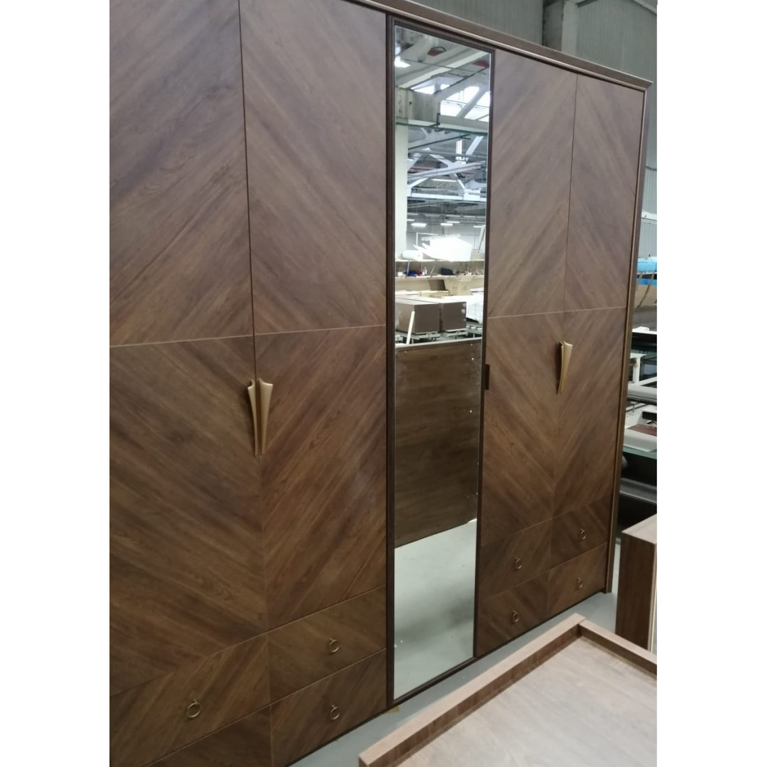 Пятидверный   шкаф для одежды с зеркалом в спальню Пальма PALMA-33   размером 2324х2354х578мм  от Беллона выполнен в необычном дизайнерском решении. Оригинальный рисункок пленки на фасаде дверей и ящиков, имитирующие шпон натурального дерева.Оригинальный рисункок пленки на фасаде дверей и ящиков, имитирующие шпон натурального дерева. Комбинированная модель шкафа с 4 дверьми и 4-мя ящиками , дополненная зеркалами, классический темный цвет орех и сочетание современного, заметьте неизбитого дизайна- это то что нужно Вашему интерьеру!