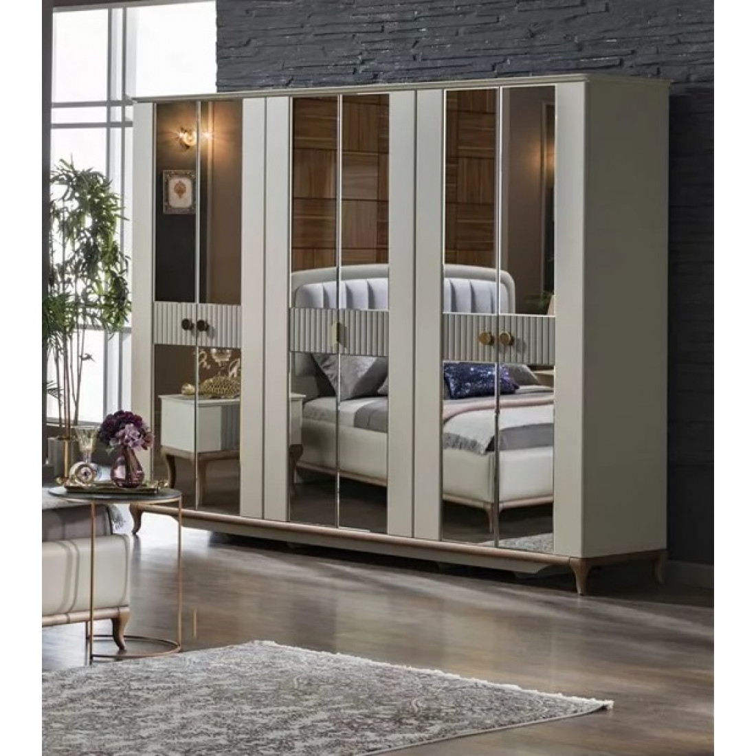 Шкаф платяной 6-дверный серии Pesaro Bellona. Изготовлен из высококачественного ЛДСП производства Турция, класс эмиссии формальдегидов Е1. Зеркальная дверь в центре с прямоугольной ручкой, двери справа и слева со вставками серого цвета и большими круглыми ручками под бронзу. Ножки и рамка из натурального дерева с оттенком медовый орех. Размеры и наполнение шкафа позволит аккуратно разместить большое количество вещей. Двери и ящики с доводчиками, обеспечивающими плавный ход и безопасность.