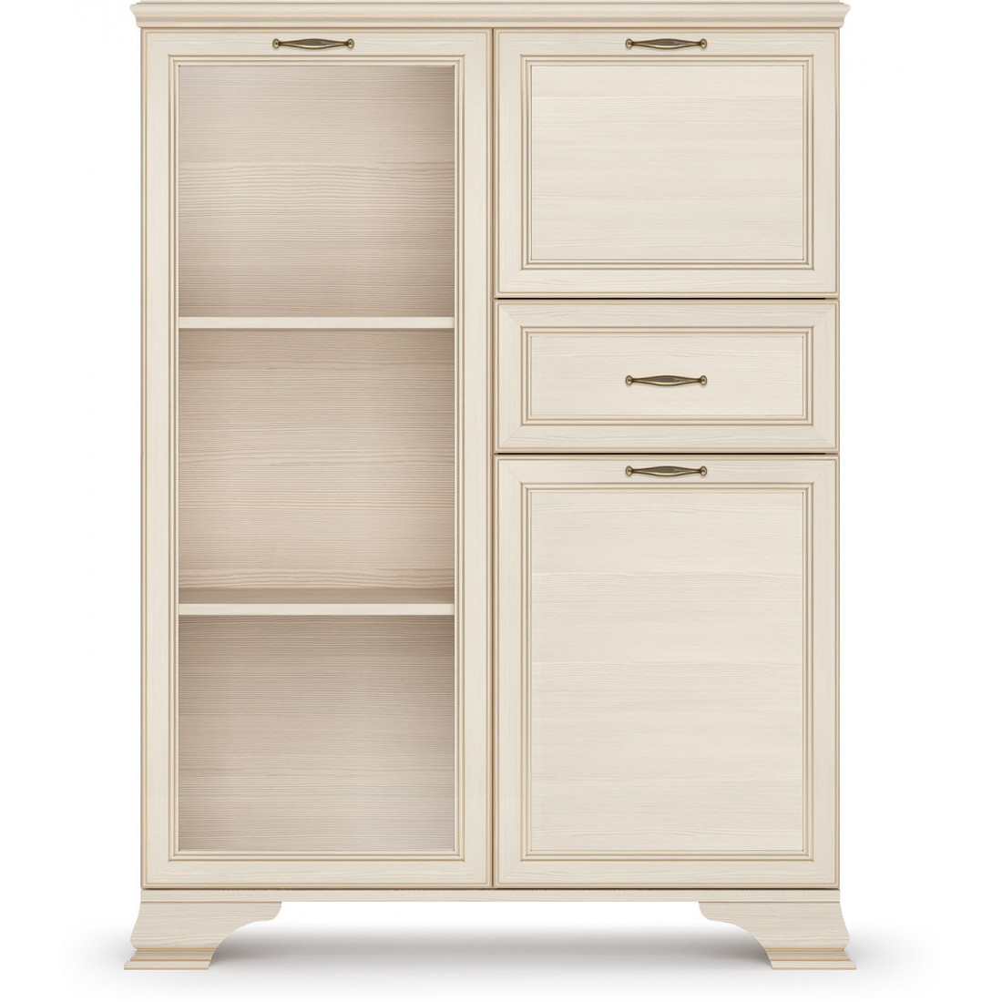 Коллекция производится в текстуре «бодега белый» с эффектом золотого патинирования. Облик «Сиены» дополняют рамочные фасады и карниз в классическом стиле, а также эффектные опоры из МДФ. Мебель комплектуются металлической лицевой фурнитурой премиум-класса в цвете «старая бронза» и надежной крепежной фурнитурой.