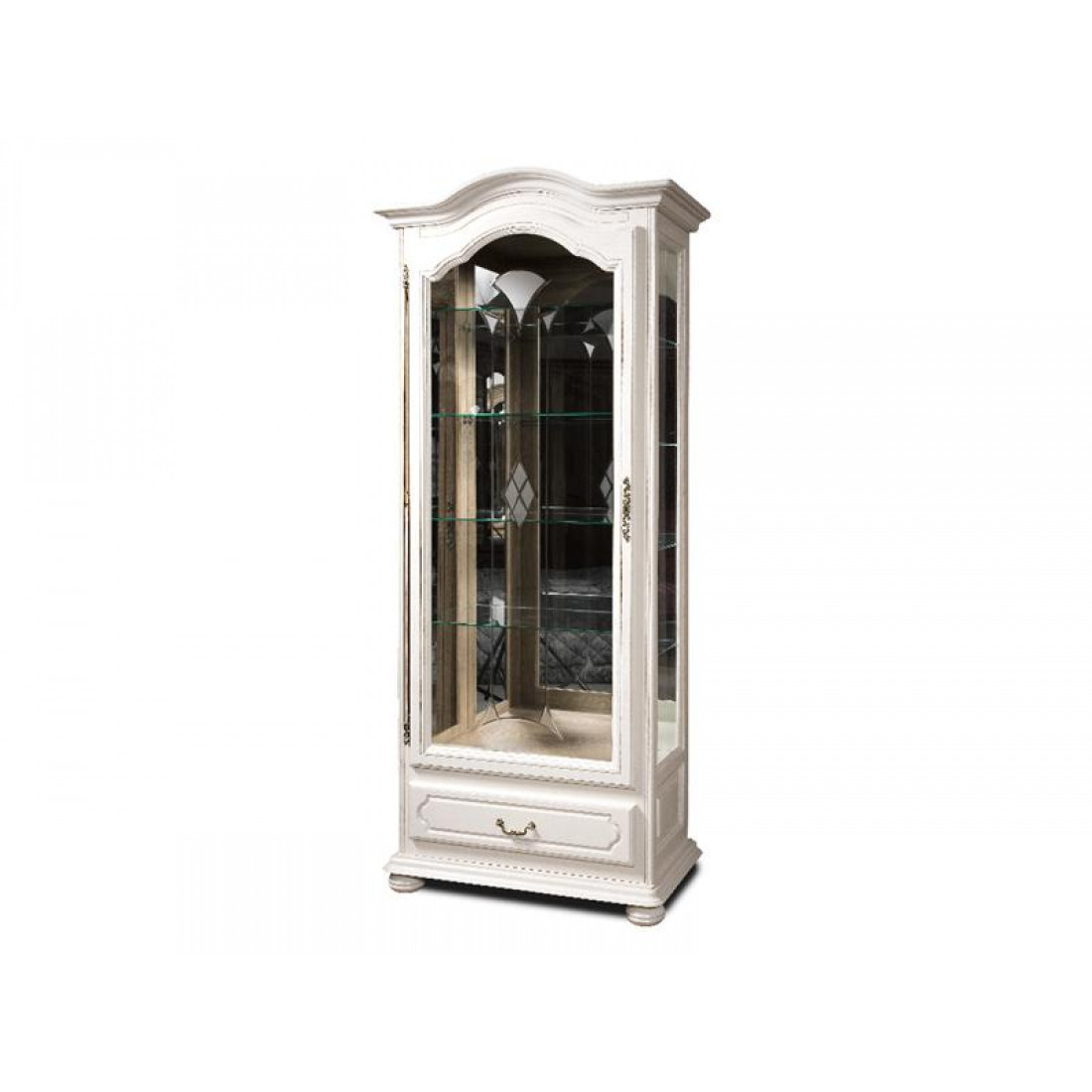 Высокая витрина со стеклянными полками и выдвижным ящиком из коллекции классической мебели для гостиной "Давиль". Декорирована изящным арочным карнизом. Фасад выполнен из массива дуба. Модель окрашена в цвет "Белая эмаль". Дверца открывается вправо.