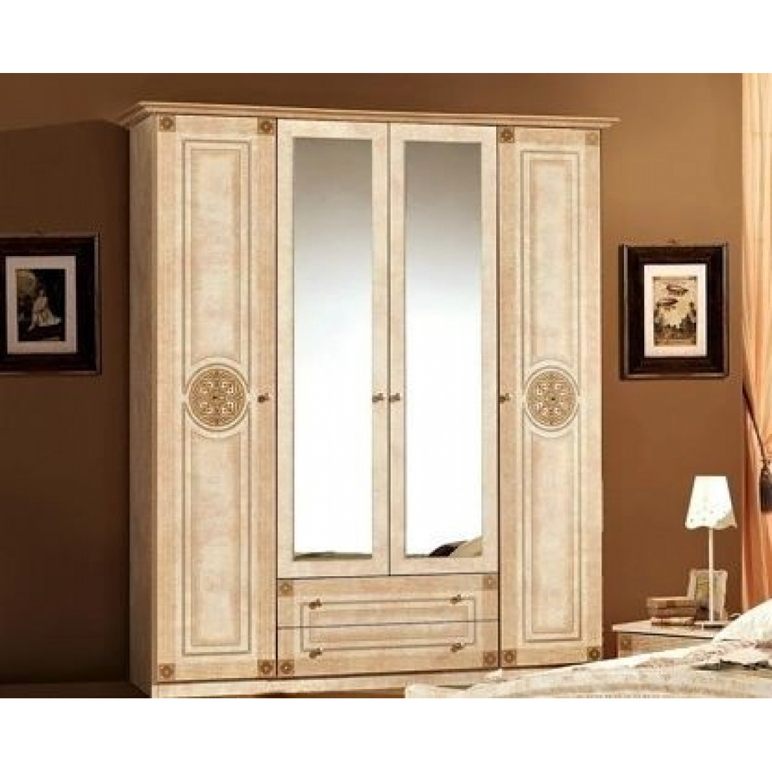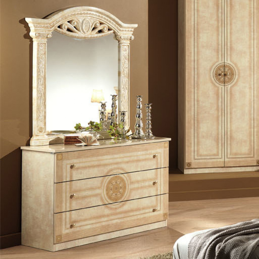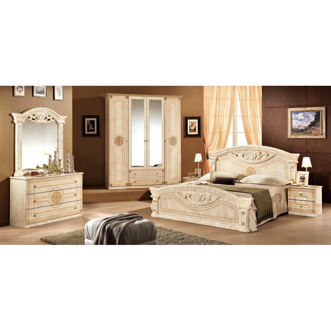 Спальня Рома (беж) от Российской фабрики «ДИА мебель» выполнена в строгом, классическом стиле. Бежевый цвет в сочетании с глянцевым покрытием придает элегантность. Такая спальня поможет Вам окунуться в атмосферу роскоши и комфорта. Безшумные и плавно закрывающиеся дверцы шкафа и комода помогут с легкостью забыть о шуме по утрам. Вся коллекция "Рома" предназначена только для истинных ценителей элегантного классического стиля.