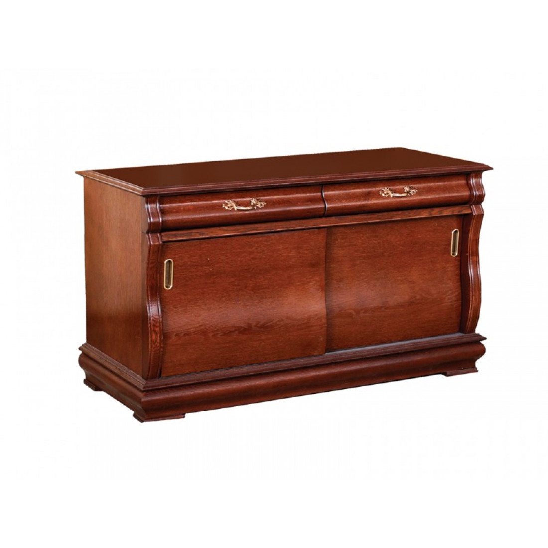 Тумба для гостиной из коллекции мебели "Оскар" это классическая и многофункциональная модель. Тумба оснащена двумя раздвижными дверцами и выдвижными ящиками с ажурной фурнитурой. Слегка изогнутые бока фасада придают силуэту модели изящность и оригинальность. Тумба выполнена с использованием массива и шпона дуба и окрашена в оттенок "Орех".
