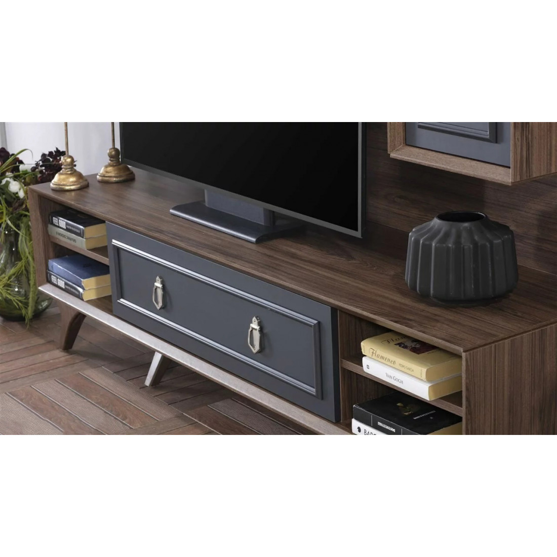 Тумба под ТВ в гостиную серии Алегро от Беллона станет прекрасным, многофункциональным дополнением интерьера гостиной. Ручки образуют единый декоративный элемент, сходясь в центре фасадов. В качестве материала для фасадов, столешницы и ножек использовался МДФ.